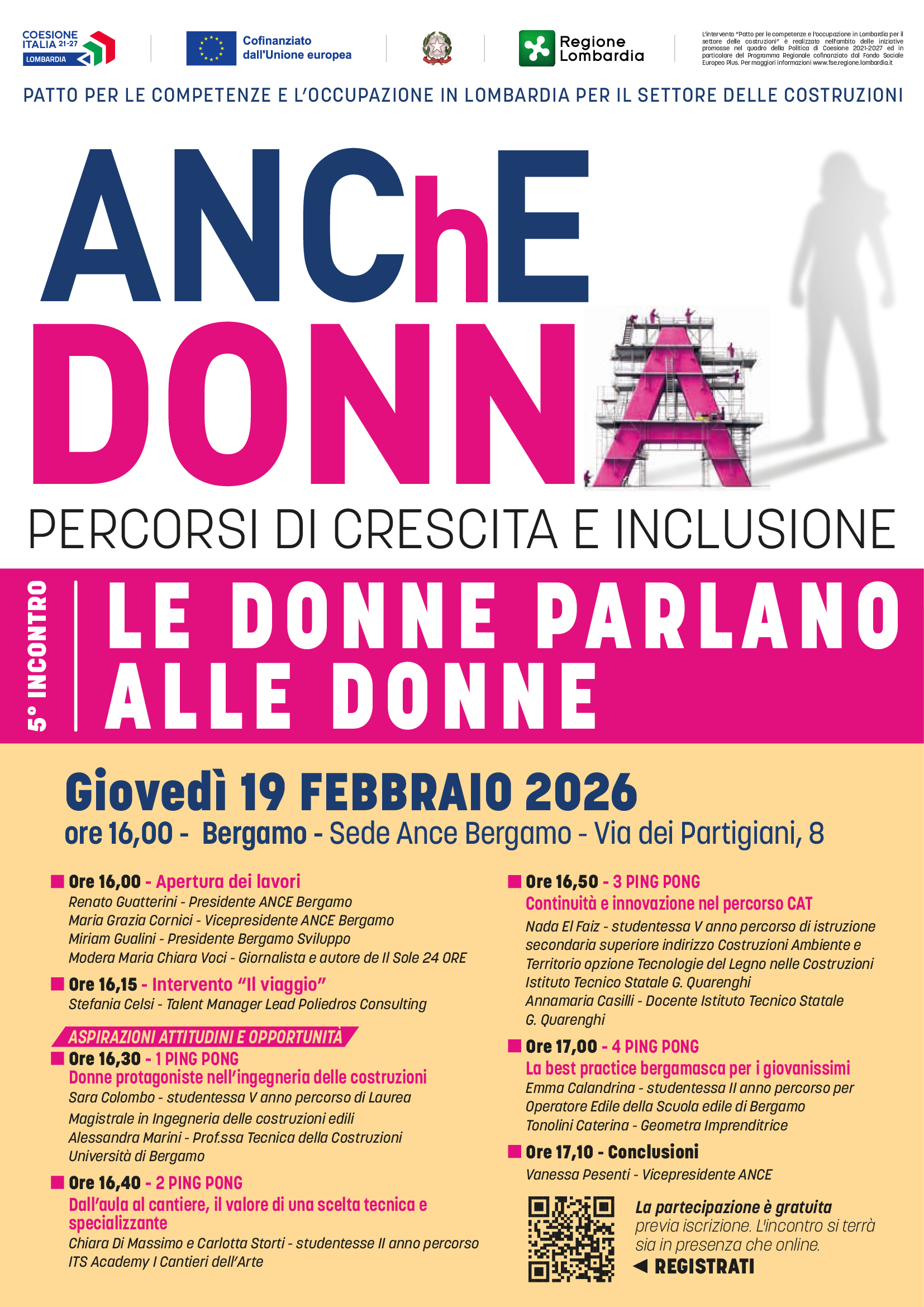 Il 19 febbraio 2026, alle ore 16.00, presso la Sede ANCE Bergamo (Via dei Partigiani 8), si terrà il quinto appuntamento del percorso “Anche Donne – Crescita e Inclusione”, iniziativa promossa nell’ambito del Patto per le Competenze e l’Occupazione in Lombardia per il settore delle costruzioni.