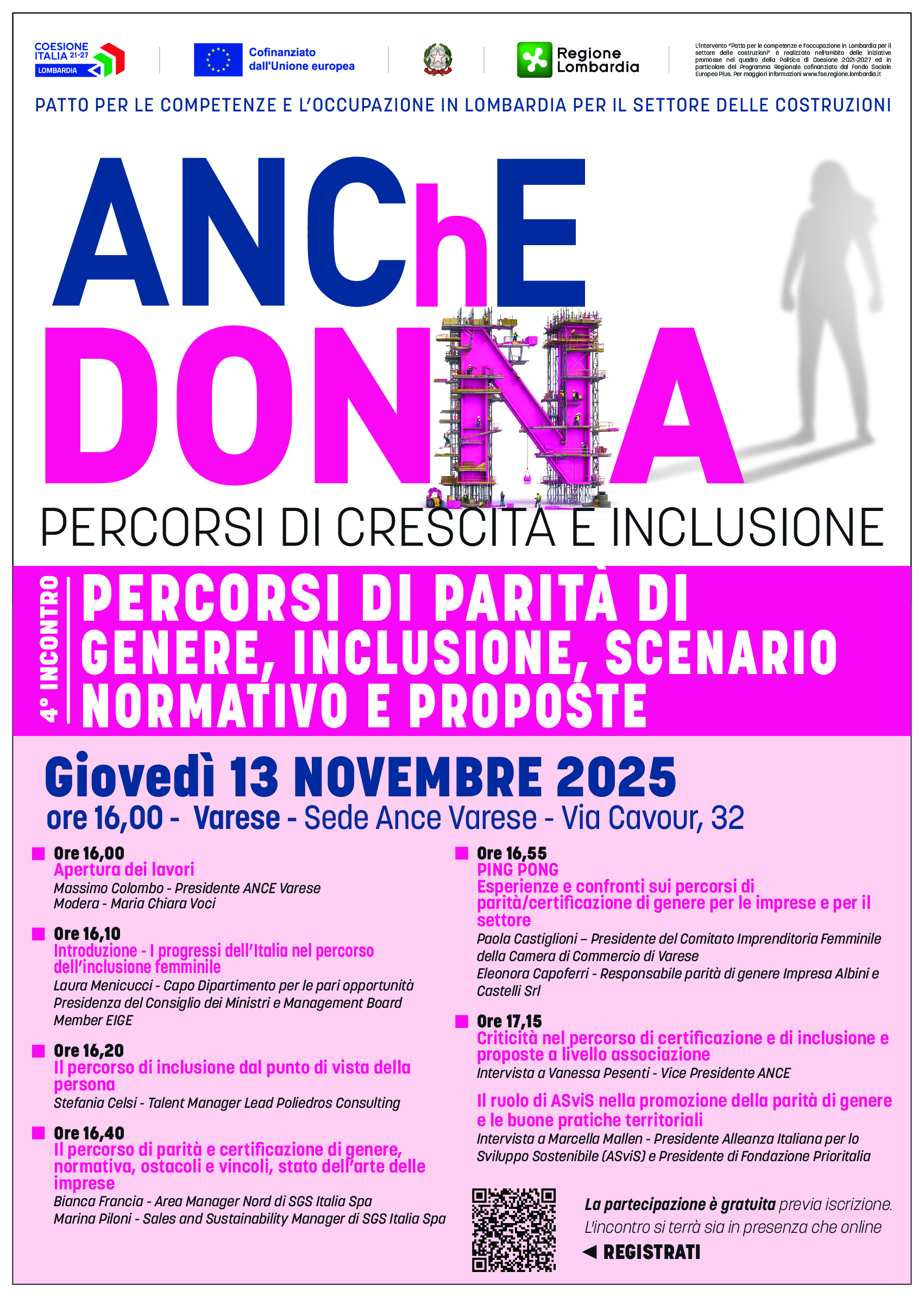 giovedì 13 novembre, alle ore 16:00, presso la sede di ANCE Varese, si terrà il quarto incontro del ciclo di appuntamenti #ANChEDONNA. L’evento, intitolato “Percorsi di parità di genere, inclusione, scenario normativo e proposte”, approfondirà le dinamiche legate alla parità di genere e all’inclusione nel settore edile.