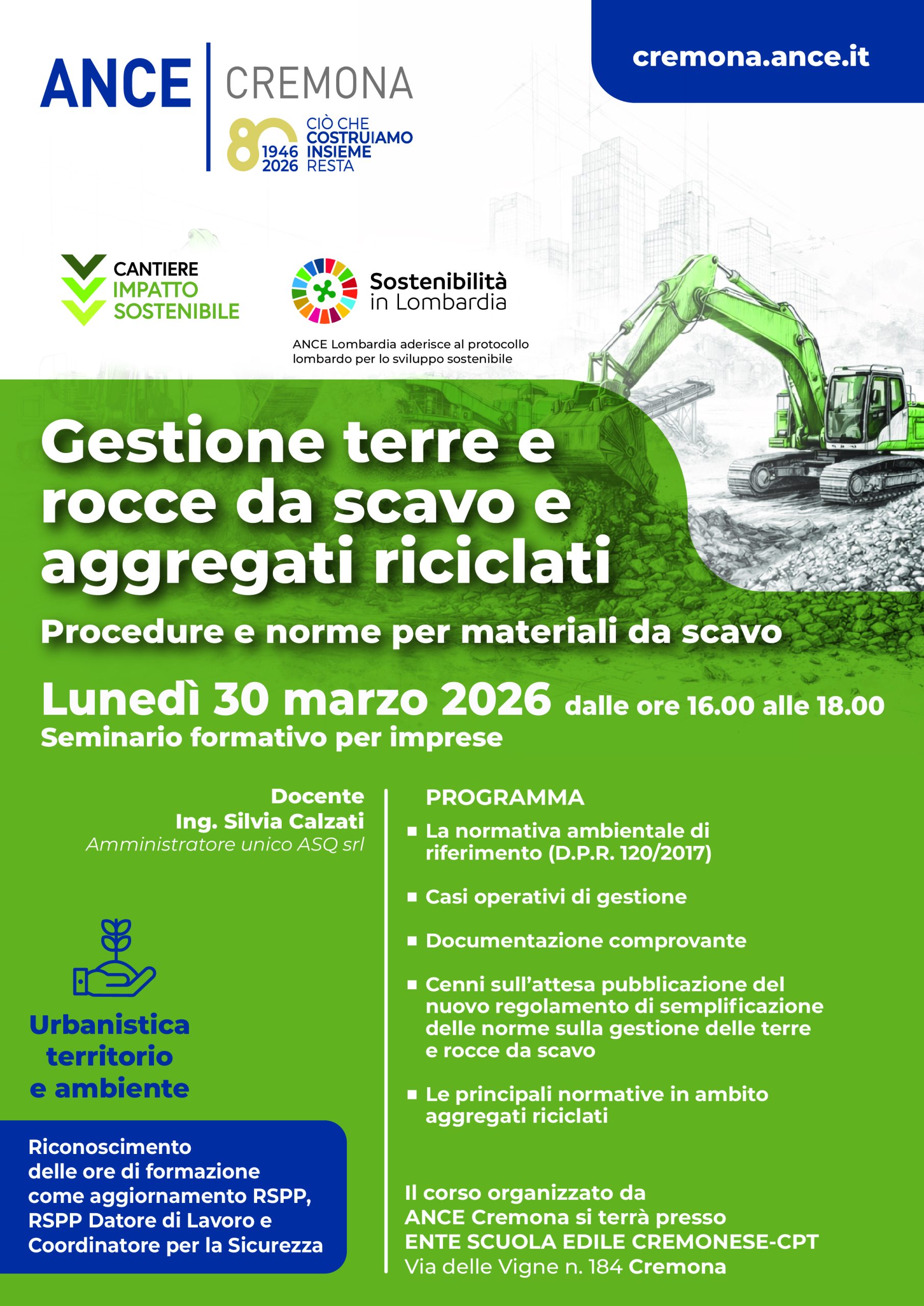 Il secondo incontro si svolgerà LUNEDI’ 30 MARZO ore 16.00-18.00 sul tema: Gestione terre e rocce da scavo e aggregati riciclati